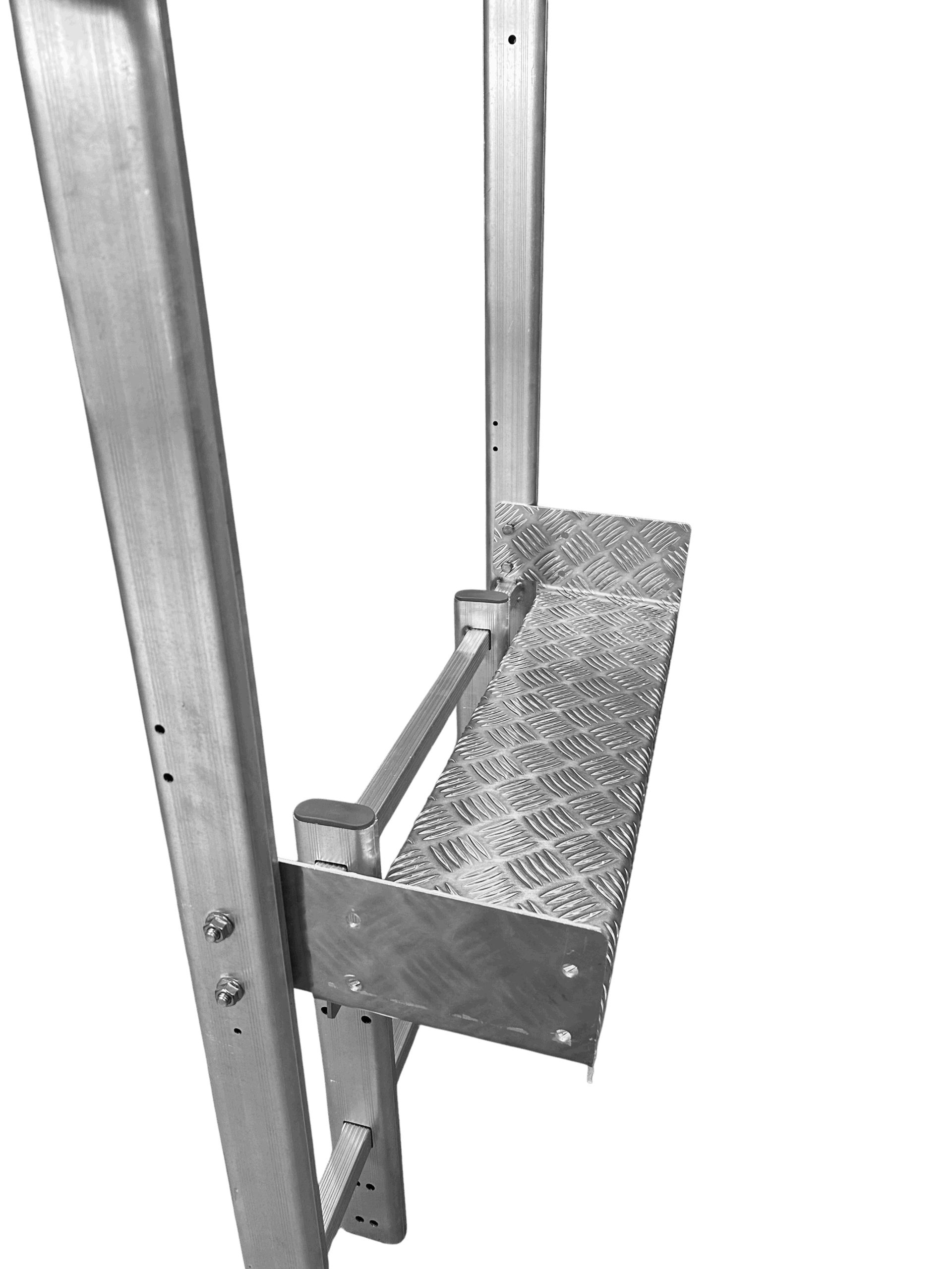 Med dette trin opfylder man kravene i EN ISO 14122, som siger: At hvis afstanden mellem øverste trin og bygning/anlæg overstiger 75 mm, skal denne være inddækket med et skridsikkert trædetrin, for at undgå brugeren kan træde ned mellem stige og bygning